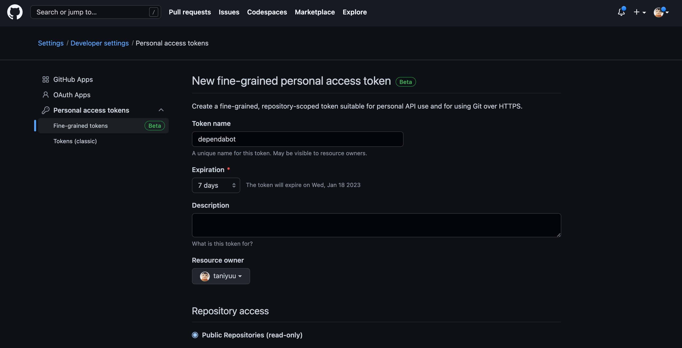 GitHub(なんかFine-grained personal access tokensなるものができてたのでそっちで作りましたが、無期限にできなかった)