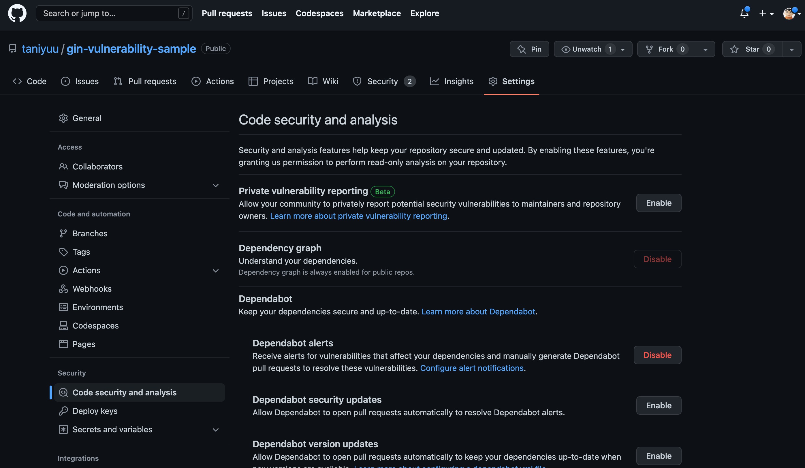- Settings > Code security and analysis > Dependabot から好きなものをEnableへ変更 今回はalertsだけにしてPRは出しませんでした